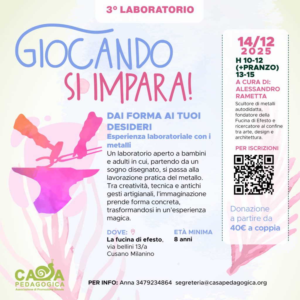 Domenica 14 dicembre presso La fucina di efesto in Via Bellini 13/A – Cusano Milanino, si terrà il laboratorio di Casa Pedagogica Giocando Si Impara.